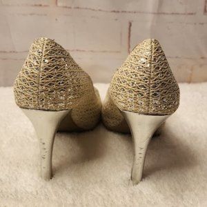 These are a cute pair of dress shoes, they do show some signs of wear and there are some staining on the lace that could be rehabbed. They are being sold as is. These shoes are cream, silver and gold with a lace design. The heel is silver and is 4 inches in length. There are some signs of wear on the heels. Please look all the photos as this is a pre-owned pair of shoes that's looking for a new home.