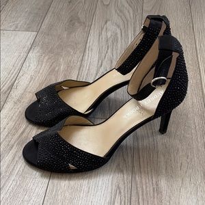 Black crystals on black satin stiletto heels with a crystal embellished ankle strap. Gorgeous for the holidays, they go with almost everything. Worn for one wedding.