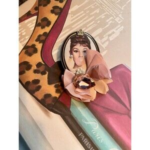 Audrey Hepburn blowing a bubble! This brooch can be pinned on or clipped. She's wearing a tiny crown and pearl earrings and necklace! With baby pink S crystal. So chic and fun!