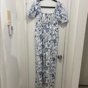 This casual sundress features a charming blue and white floral pattern, perfect for a relaxed day out. The scoop neckline and puff sleeves add a touch of elegance, while the maxi length offers a breezy, comfortable fit. Ideal for enjoying sunny days with style and ease.