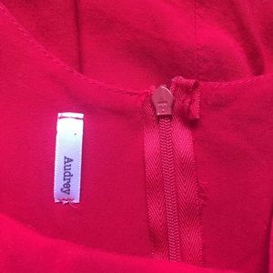 Super cute casual knee-length red dress. Perfect for spring layering! Lightweight cotton blend with printed black geometric detail, 32.5" shoulder to hem, 13" flat across waist, fits 34 B/C bust. Anthro for exposure.