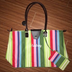 Full zipper. Dimensions: 12” tall handles, 13” height, 16.5” length, 6.5” width. Green, red, pink, blue, white stripes. Brown handles and accents. “Audrey” embroidered in white on front. Includes removable small bag that matches. Small bag dimensions: 6.5” x 4”. Fully zips.
