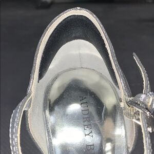 Audrey Brook Silver 5.5” Heel w/ Strap. Right interior is a little glue residue from insoles. Comes from a smoke free home.