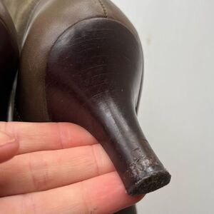 Step into early 2000s glam with these Audrey Brooke mid-calf heeled boots in a chic camo green suede and leather combo. These pointed-toe boots feature a mixed-material upper (leather and suede), with a sleek sculpted heel and a side zipper for easy wear. The camel-brown sole and stitching elevate the look while the camo green suede gives off subtle Y2K edge meets modern minimalism.