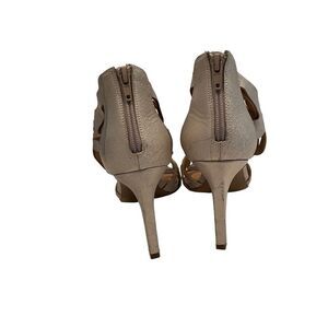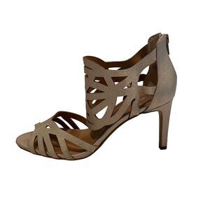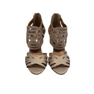 Beautiful Audrey Brooke gold shimmering heels with cutouts. Back zippers and spiked heels. Please note: the back of one heel has a little damage.