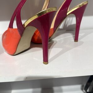 Bold orange and pink slingback heels. Peep-toe design. Perfect for a chic look.