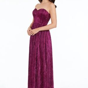 Pleated metallic purple strapless gown. Size small. Wore once for a wedding and unlikely to have another occasion for it. Super comfortable and packs easily without having to worry about steaming it!