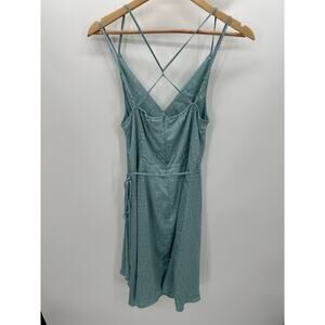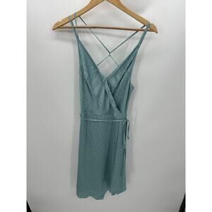Blue faux wrap sleeveless strappy midi dress. Tie waist, back zipper closure, strappy back.