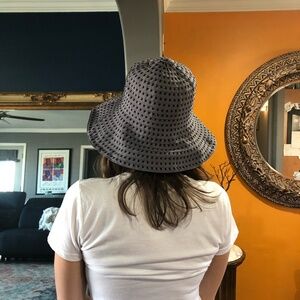 Perfect for your fall threads! August Grey Bucket Hat with bow and black polka dots.