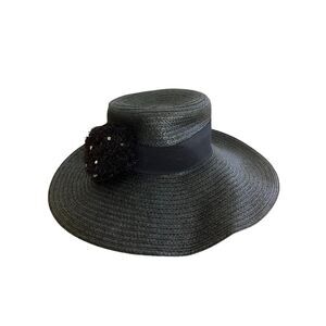 Elegant August Hat Company black straw hat with wide brim and floral sequin embellishment. 7-inch head opening. Perfect for weddings, Derby, and special occasions.