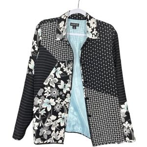 August Max SILK Floral Patchwork Pattern Button Down Lined Blazer Jacket Black Blue White