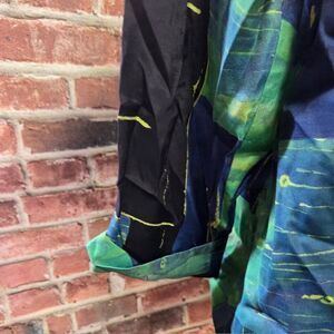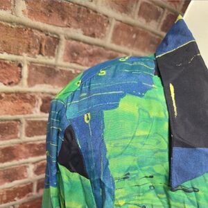 Make a powerful vintage statement with this August Max Woman jacket, featuring a vibrant abstract print, open front, and classic 1980s-inspired padded shoulders. With a bold color palette of blue and green, this relaxed-fit piece adds flair to any outfit — ideal for layering and turning heads.