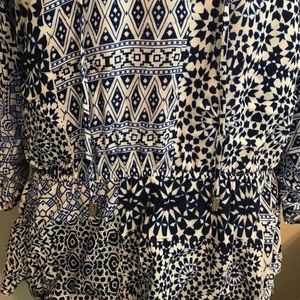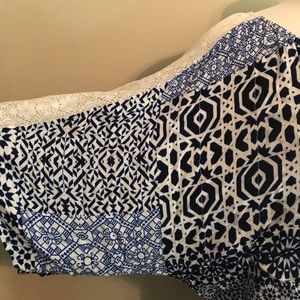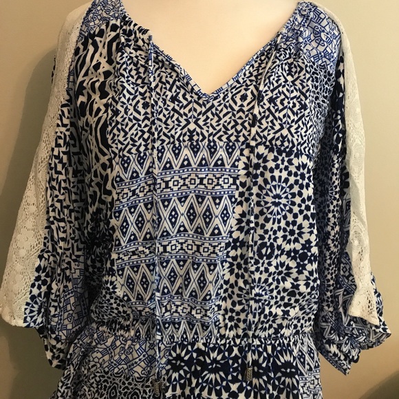 NWT - August Silk lightweight blue and white patchwork long-sleeved shirt with elastic waist, lace on sleeves.