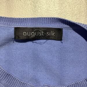 This August Silk women's cardigan in light blue features a full button front and a classic crew neckline. Made with a soft, lightweight knit, it’s perfect for layering in any season. Please refer to measurements for sizing, as the inner tag is missing. Small faint stain on the front (see photos).