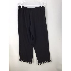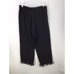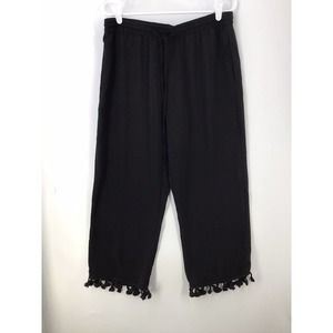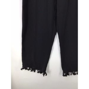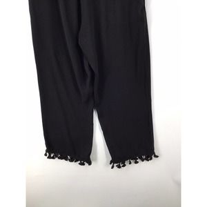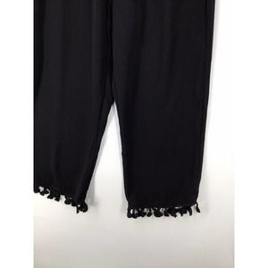 Sophisticated black jumpsuit with tassel accents. Cropped design for versatile wear.