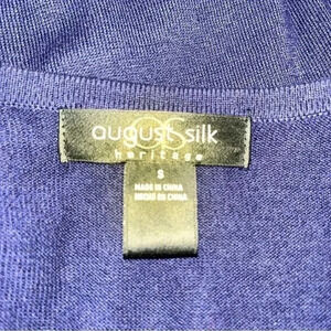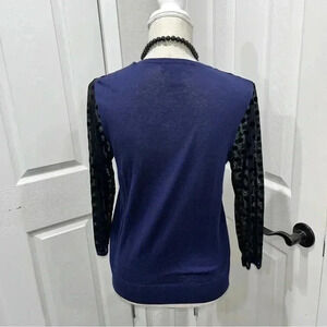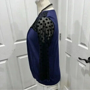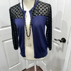 August Silk Navy blue and sheer black polka dot lace button front cardigan