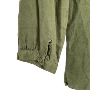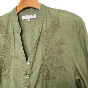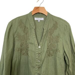 August Silk Options PL 100% Linen Green Blouse Floral Embroidered Button Up Top
