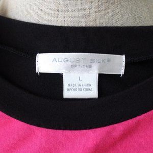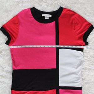 August Silk mondrian color block, short sleeve tee shirt in red, pink, and white. Crew neckline with black trim along neckline and sleeves, the shirt is comfortable with stretchy material. Size Large.
