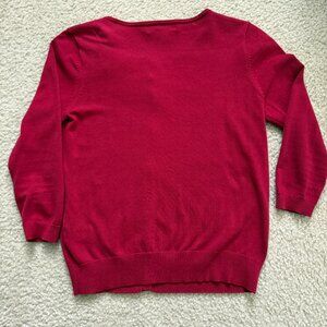 Christmas Red August Silk 3/4 sleeve sweater with beaded black bow on upper left shoulder with black buttons, size small