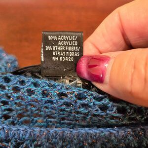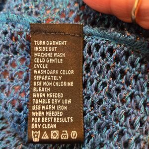 Size L; Material - 97% Acrylic, 3% Other Fibers; Machine Wash Inside Out Cold; Made in USA; Blue Open Weave Knit with Metallic Thread Through it. Good for Party / Workwear. Boat Neck, Collarless, 3/4 Sleeves, High Low Hem.