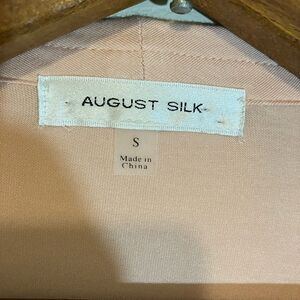 This is a beautiful August Silk cardigan. It is lightweight and has a sheer bottom detail. It is a beautiful peach color and a women’s size small.