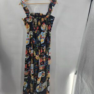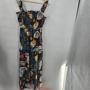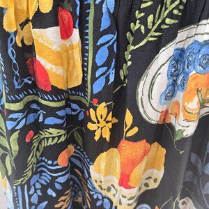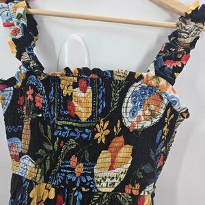 August Sky Black Fruit Breakfast Square Neck Ruched Midi Dress Small NWOT