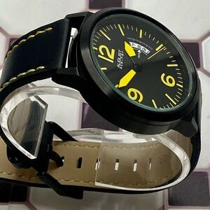 August Steiner bold black & yellow watch with leather strap. Watch features a black stainless steel case and black dial with oversized yellow hands and date indicator at 3 o'clock. The black leather strap with yellow contrast stitching perfectly complements the yellow hands and hour markers. The case back is marked, 'August Steiner, Stainless Steel Case, 5 ATM Water Resistant, Japan Movement, AS8012YL." The watch case measures approx. 44.4mm across excluding the crown, and the total length of the watch with leather strap is approx. 10" (maximum wrist size of approx. 8"). Watch is in good condition with a scratch-free crystal and almost no wear to the case other than some scratches on the back side from someone opening the case back. Watch has a new battery, keeping time and date indicator is functioning as it should. Comes with the original box and paperwork (box does have some damage - see photos). Just a bold statement watch! Thanks for checking out my closet!