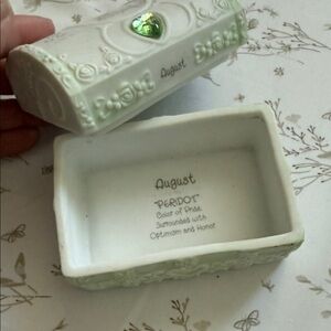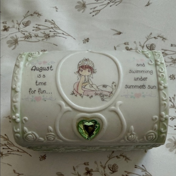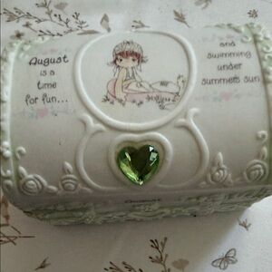 PRECIOUS MOMENTS COLLECTION JEWELRY TRINKET. Charming decorative box featuring a whimsical August theme. Perfect for adding a touch of elegance to your space. Jewelry not included. CORCA 90s