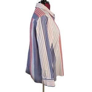 Multicolored top, striped pattern, collared, long sleeves, cuffed, button down, regular fit, lightweight, breathable and cute. In great condition.