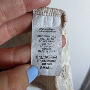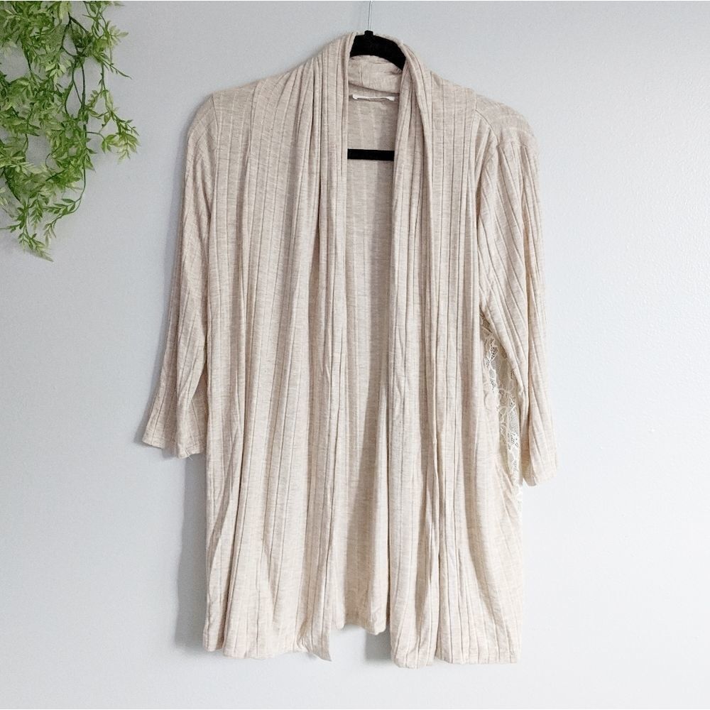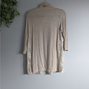(August Mist) Tan ribbed Open Cardigan Cream Lace Sides Small. Excellent condition.