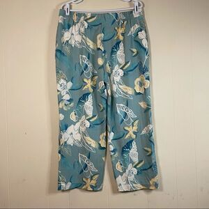 These pretty pants are in excellent pre-owned condition. They are a teal blue/green shade with yellow and white footwear. They are slightly cropped to fall around ankle length. There are two elastic inserts in the back to allow for a more comfortable fit. The silk makes them breathable and lightweight which is perfect for summer!
