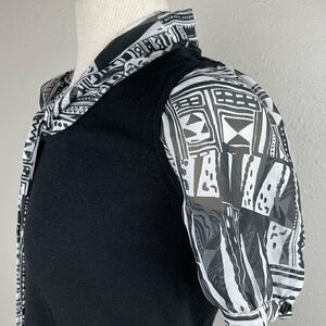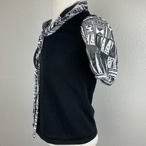 Stylish sweater vest style top featuring a slightly sheer design at the sleeves and collar. The scarf design is attached. It is a size large and measures 18 inches armpit to armpit laying flat and 20 inches in length from shoulder to hem.