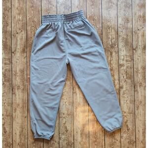 Augusta baseball pants in gray. Elastic waistband with inside drawcord. Right back patch pocket. Reinforced double knees. Elastic cuffs. Adult size small.