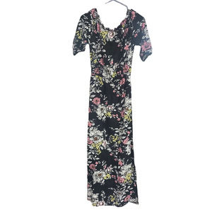 Breezy, boho, off the shoulder maxi dress in black with floral print