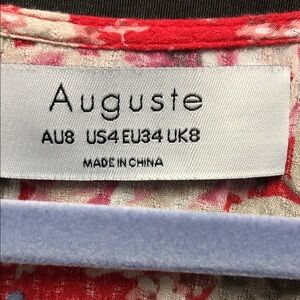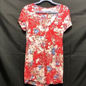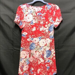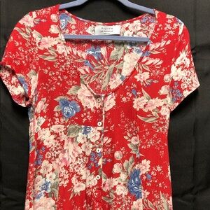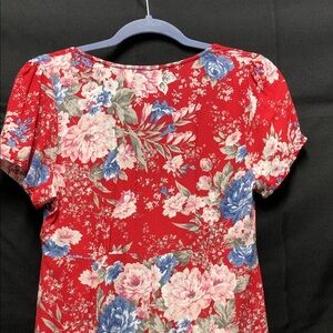 Charming red blouse with floral design. Features blue and white accents. Ideal for a vibrant look.