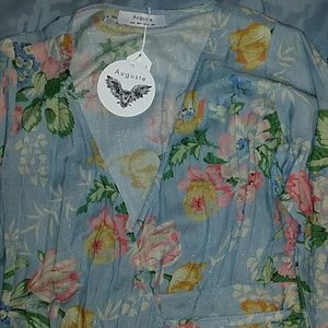 Delilah Bloom poet wrap maxi dress in duck egg pastel sky blue by Auguste the Label. Size AU 8 or US Small. Big floral blooms print with gold lurex. No longer new with tag. Worn 1x & washed per care info. No trade please. Price is firm & reflects high % posh fee