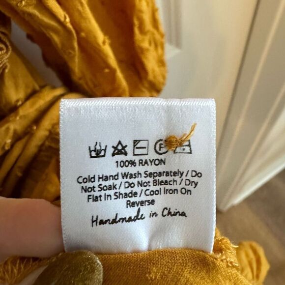 Auguste the Label Tour Ryanne Dress size 0. Oversized style mini dress with long balloon sleeves, ruffle hem, loose swingy skirt, open back, and button detailing down the front and back. Mustard yellow color with a Swiss dot texture to it. Perfect for a beach vacation or even Sunday brunch! One of the loops for the buttons on the back is a bit stretched (see last photo) but other than this in great condition.