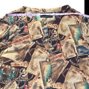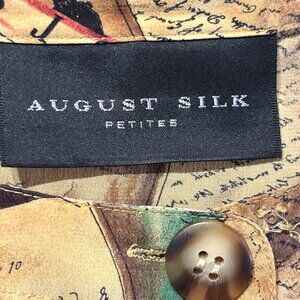 The August Silk Petites Vintage Navigation theme Long Sleeve Button-up Blouse in size PS is a stylish and versatile addition to any woman's wardrobe. Made of lightweight silk fabric, this blouse features a round neck and button closure, perfect for casual, workwear, or travel occasions. The vintage navigation theme adds a unique touch to the multicolor design, making it suitable for all seasons. With features like shoulder pads and non-iron properties, this blouse offers both style and convenience for the modern woman. Made by the reputable brand August Silk, this blouse is sure to become a go-to piece for any fashion-forward individual.
