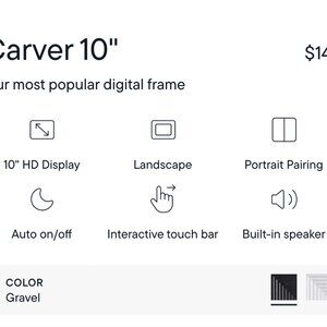 Share unlimited photos and videos from your phone to Carver, Aura's best-selling HD frame. Featuring a 10" landscape display, intelligent photo pairing, and built-in speakers for video, Carver is crafted from premium materials to complement any space in your home.