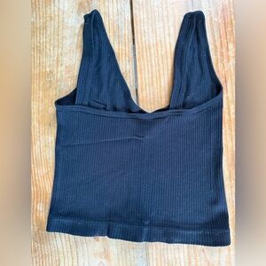 Stylish black ribbed tank top. Perfect for layering or wearing alone.