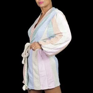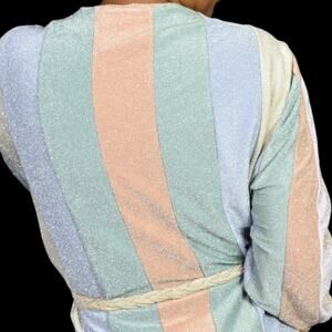 Aura wrap dress FEATURES a striped pastel rainbow colorblock pattern. Shimmer metallic jersey fabric. Wrap front. Bishop sleeves. V-neck. Above knee length. Braided self fabric belt at waist. Lined.