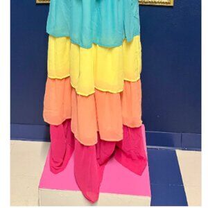 The Aura Rainbow Tiered Maxi Dress showcases expertly designed tiered ruffles that add texture and movement, complemented by bold color block panels for a vibrant, contemporary feel. This dress combines playful details with a feminine silhouette, ideal for those seeking a stylish piece that stands out with effortless charm.