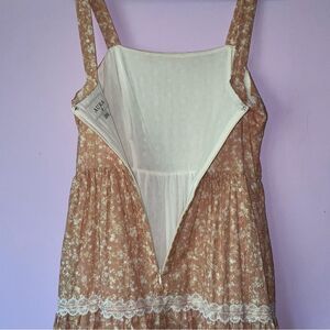 Charming floral maxi dress with delicate lace trim. Features a lovely tan color with white floral patterns.