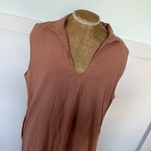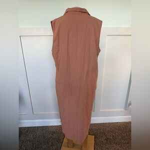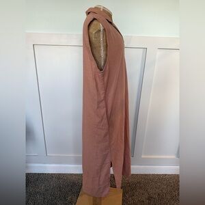 Aura The Label Linen Blend Midi to maxi length Dress in Pink/Peach. Dress is sleeveless, collared and v-necks. Split hem up each side of the dress. Pockets on each hip.