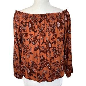 Romantic and effortless, this off-the-shoulder blouse by Aura the Label features a rich rust hue with an allover floral print that evokes vintage charm. The smocked neckline and hem provide a flattering, blouson silhouette, while the self-tie keyhole front adds a soft, feminine touch. Made in Indonesia from lightweight woven fabric, this top is perfect for laid-back weekends, festivals, or layering under denim jackets. New with tags.