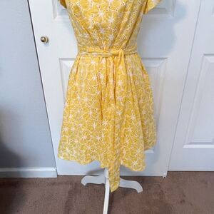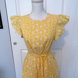 Aura Yellow Eyelet Dress with Tie Waist and Ruffle Sleeves Size XS