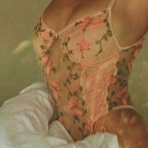 Elegant sheer bodysuit with floral embroidery. Features delicate pink and green details.