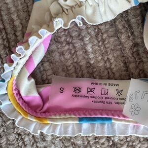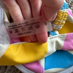 Vibrant bikini set with abstract patterns in pink, yellow, and blue. Perfect for a stylish beach day.