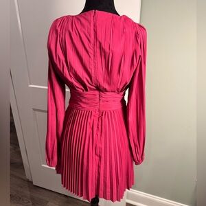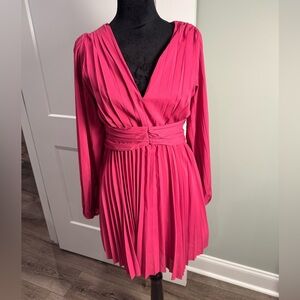 This stunning pink sundress from Anthropologie features a flattering v-neckline and elegant bishop sleeves. The pleated and ruched details add a touch of sophistication, making it perfect for a cocktail party or a night out.