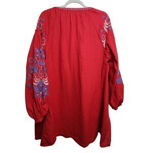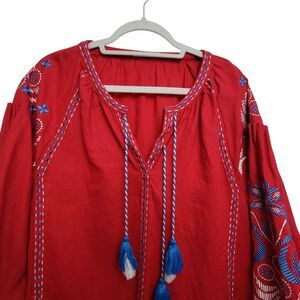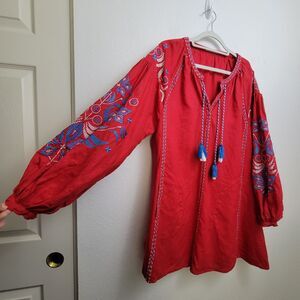 Aurie L'Atelier Red Embroidered Dress W/Missing String + Tassel No Size/Fabric Tag. The dress is in pre-owned condition with a missing string and tassel. The dress is also missing the size and fabric content tag. The dress feels like it is made of linen, but that would be a guess.